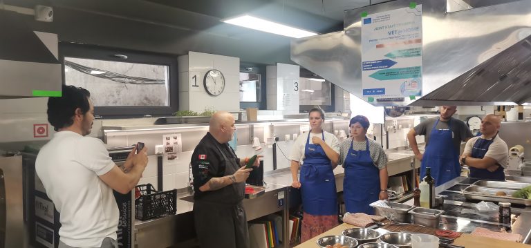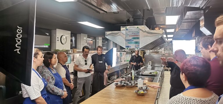 Участниците посетиха Института по кулинарни изкуства към Висшето училище по мениджмънт (ВУМ), където в учебната кухня на института бяха заснети видео-демонстрации за платформата за електронно обучение VET@HOME. Представителите на българския партньор Линтик, които осъществиха видео-заснемането на демонстрациите, заедно с шеф-инструкторите от Института по кулинарни изкуства, разясниха спецификата на планирането, организирането и провеждането на видео-демонстрации по подходящ начин, така че те да могат да се използват за образователни цели и да служат като уроци по готварство в дистанционна форма на преподаване.